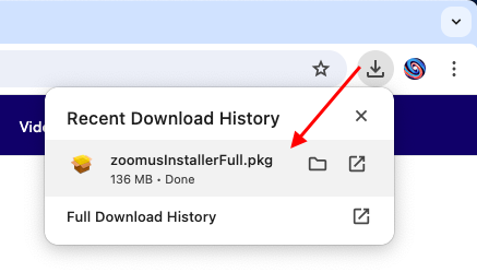 3. In the upper right-hand corner of your Chrome window, the download icon will turn into a blue progress bar, and then turn into a downward-facing arrow when the download has been completed. Click on the arrow icon when this happens, and double-click on "zoomusInstaller.pkg" to open it.