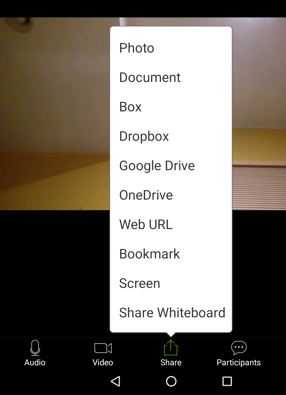 • Screen: share your Android screen (participants will see exactly what you do)