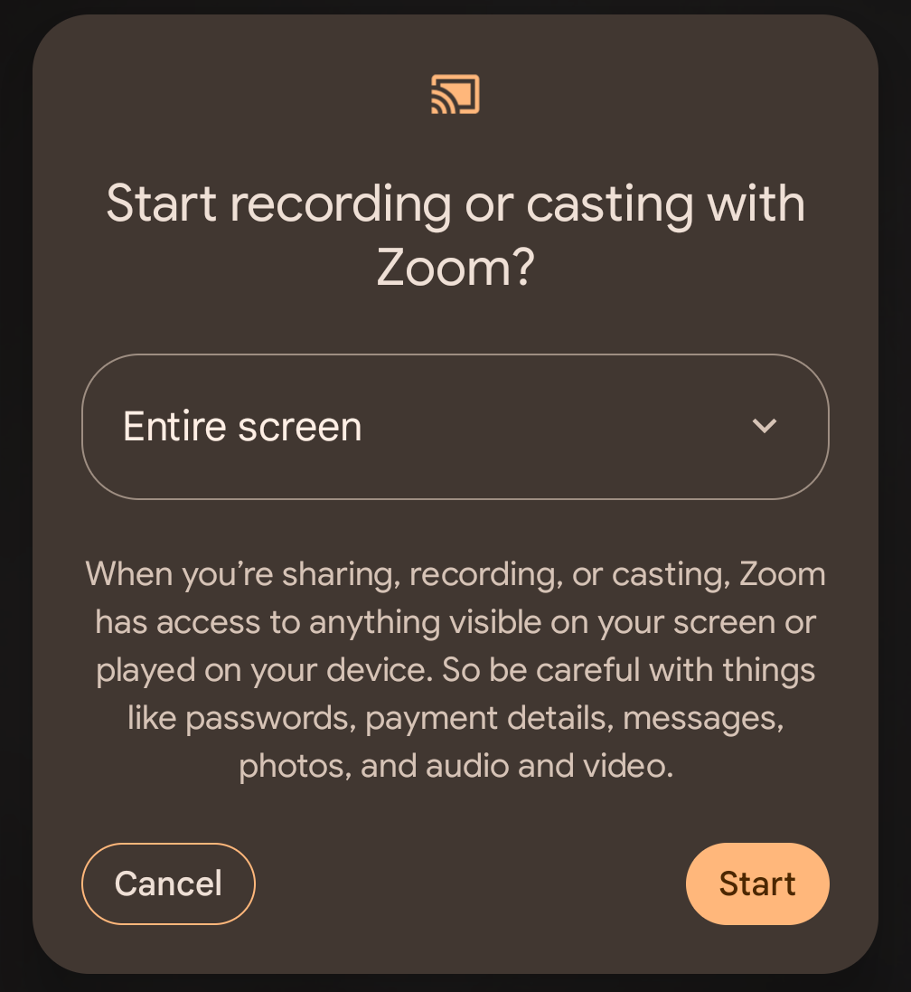 3a. If you select Screen, you'll see a prompt asking for permission to begin streaming your phone screen. Click "Start" to allow it.