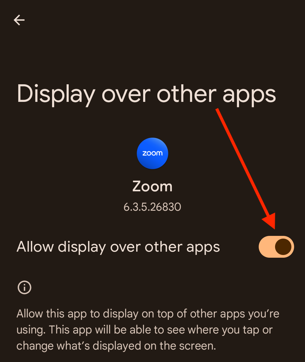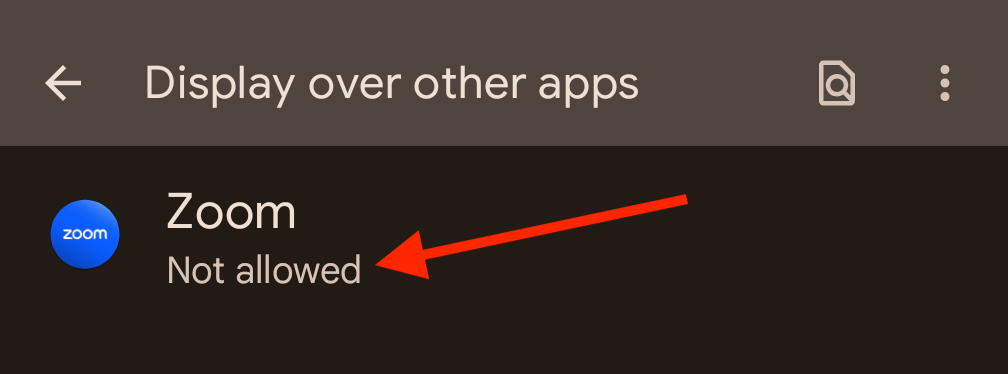 This will open up your permissions (called "Display over other apps") and you will need to scroll down to find and select "Zoom".