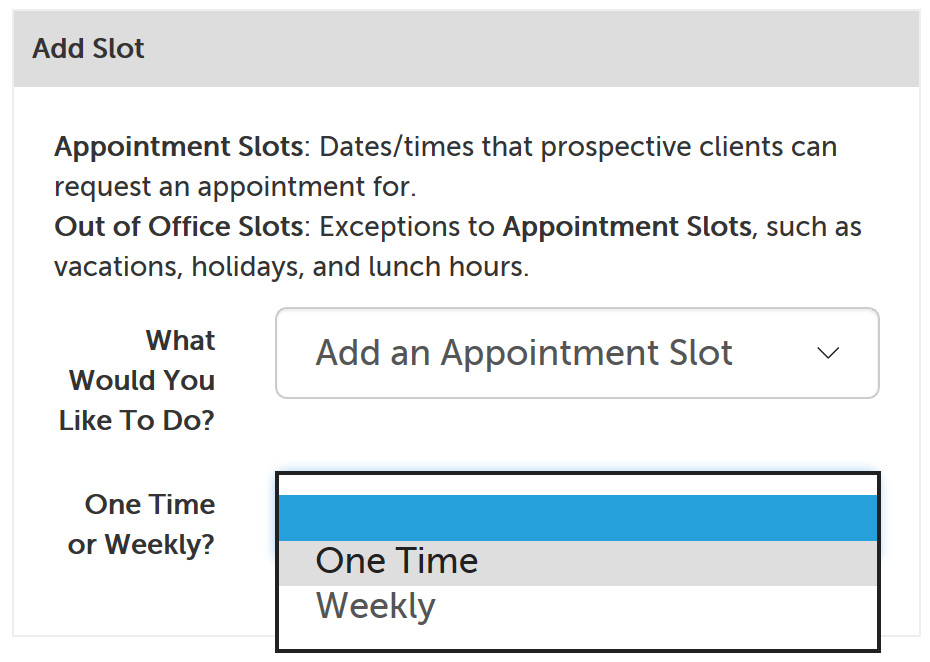 Appointment Slots allow you to list available dates and times on a public calendar, so that current and prospective clients can request a scheduled session, if the provider has the feature enabled. For a good overview of this feature, please see the video recording of a webinar we hosted on this type of virtual clinic.