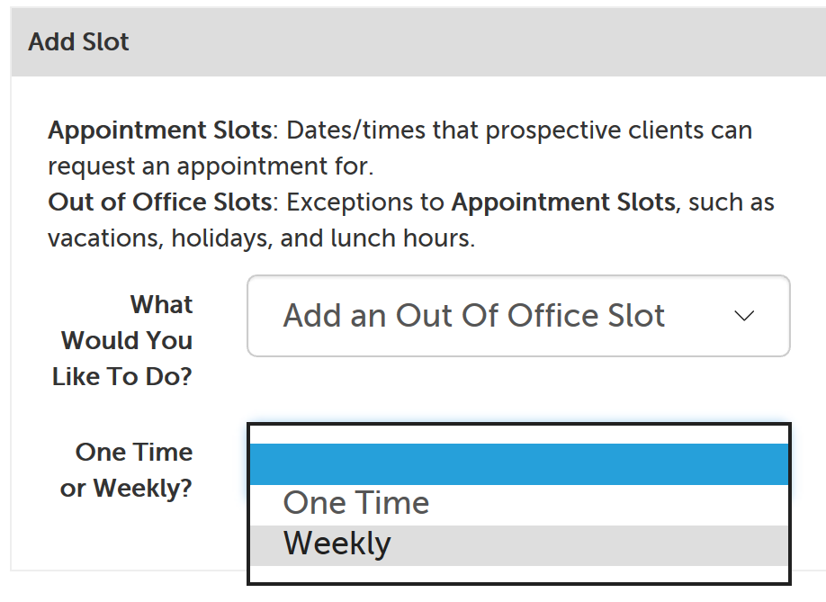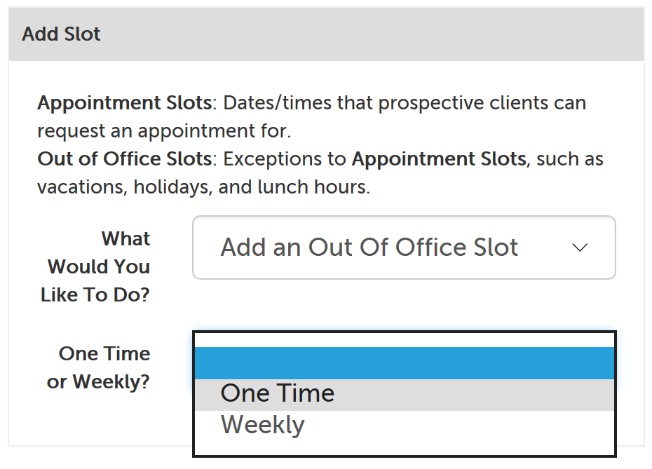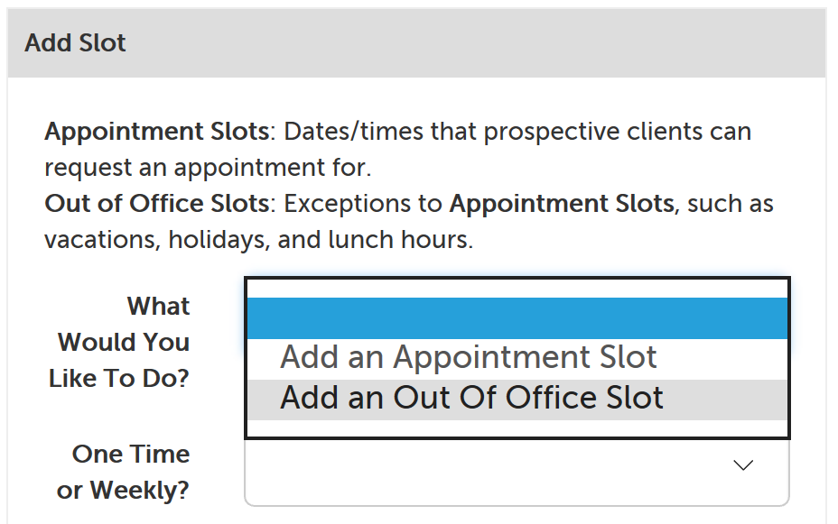This support article will go over the process for adding out of office slots to your calendar, which are exceptions to any appointment slots you have already added (or may add) in the future. (If you use the Google Calendar or Microsoft Outlook calendar integrations, our system will already reference your other calendar for times that you have something else scheduled, so that it is not shown to potential participants. You will not need to add an out of office slot if that time is already blocked off in your connected Google or Outlook calendar.)
