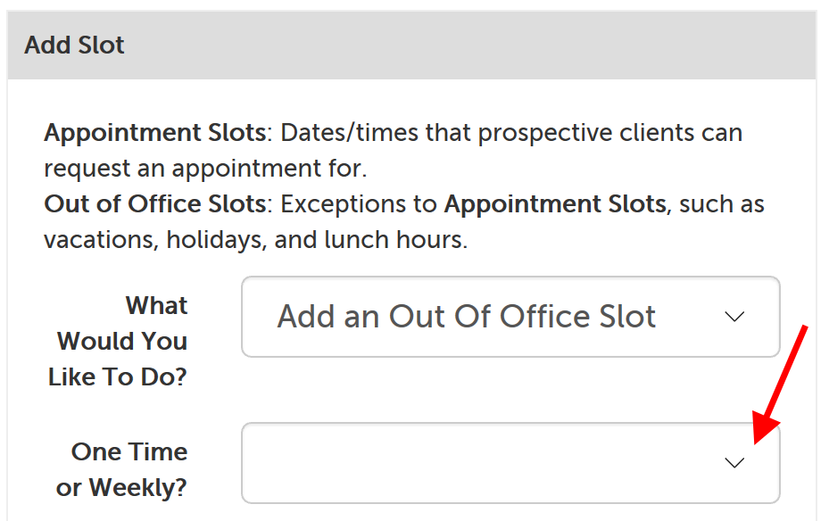 2. Click on the dropdown next to "What Would You Like To Do?" and select "Add an Out of Office Slot".
