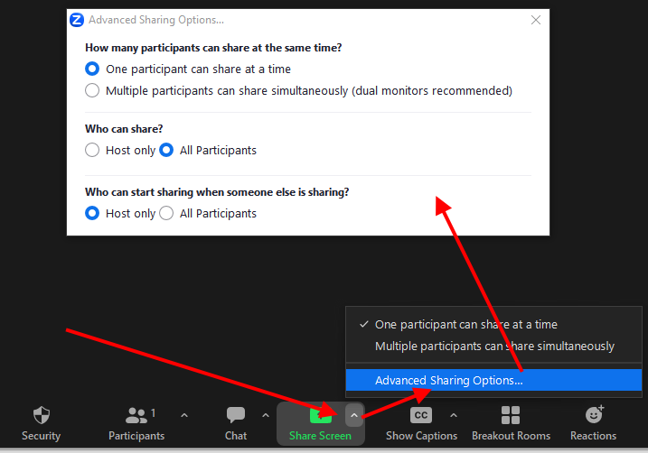 1. Click the ^ symbol to the right of the "Share Screen" button, and then select "Advanced Sharing Options".