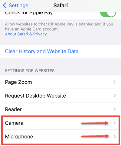 Screencap showing website preferences, with an arrow to the Camera and Microphone lines