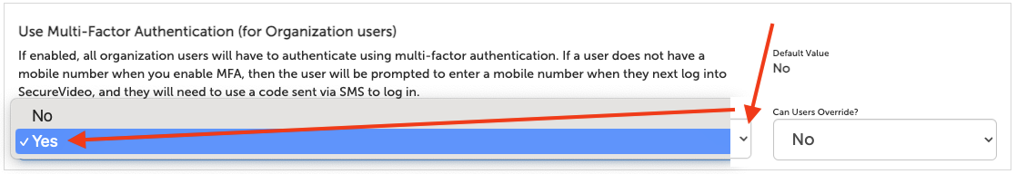 • If "Yes" is selected, then all organization users with a mobile number in their profile will be prompted to enter a code sent by SMS when they log into their account (see section, Logging in with Multi-Factor Authentication). Users without a mobile number will be prompted to enter one upon their next log in, and then enter the code sent by SMS.